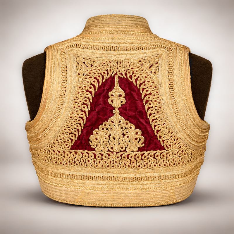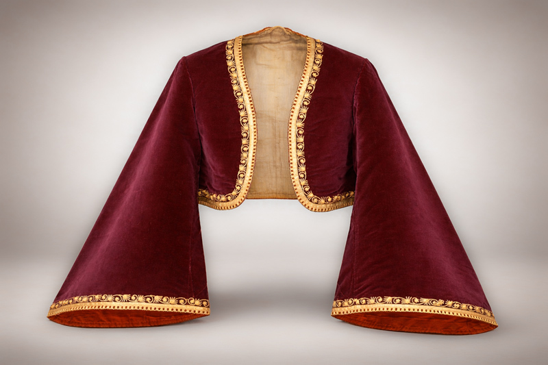Јелек женски, Е-367, Крагујeвац, 19.век. Срмени јелек, део оријенталне ношње. Покрива груди; спреда отворен са два низа украсних дугмади са црвеним перлама, испод којих се копча на две копче. Срмени гајтан покрива целу површину јелека, осим средишњег дела на леђима. Истичу се орнамент осмице, таласасте линије и густе вреже као карактеристични орјентални мотиви. Материјал: љубичасти сомот, срма; техника: терзијски вез.