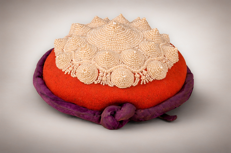 Тепелук, Е-463, Ниш 1954. Женска капа, део српске грађанске ношње. Украшена низовима бисера у облику купа, тако да је у средини највећа, а около мање купе, док је међупростор попуњен орнаментом у облику слова М. Материјал: црвена чоја, бисери, техника: вез.
