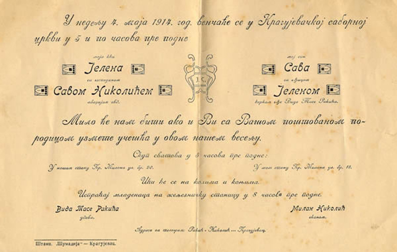 Позивница за венчање, ЕПГ-21, 1914, Крагујевац. Позивница, дволист, Јелене Тасе Рајићеве и Саве Милана Николића, за венчање у Саборној цркви. Скуп сватова најаваљен је у 5 сати ујутру, венчање у 5.30 а испраћај младенаца колима и коњима на железничку станицу у 8 сати ујутру. Материјал: папир; техника: шампа.