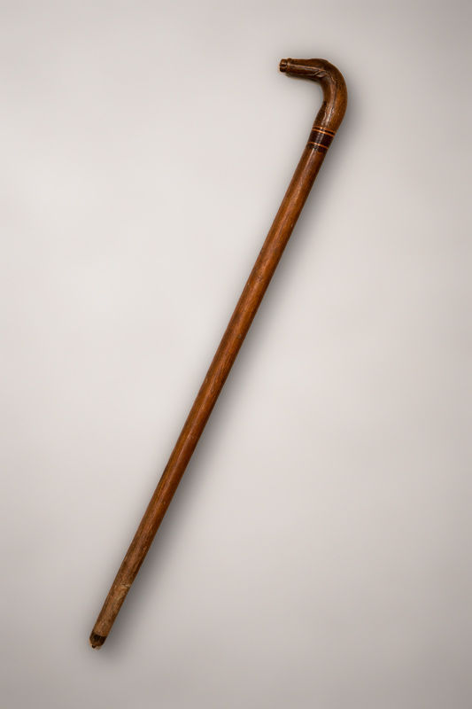 Штап Е–1672, Бело Поље, 1948. година. Израђен је од ораховог дрвета, природно савијеног. Дршка је изрезана у виду коњске главе са гривом и уларом. Испод су, као украс,  уметнута три прстена од светлијег дрвета.