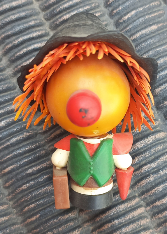 Јанез Е-4329 Фигура од бојене пластике, округле наранџасте главе са црвеним носем и наранџастом косом испод црног шешира са два пера. Тело ваљкасто, са зеленим прслуком,  у рукама носи кофер и кишобран.