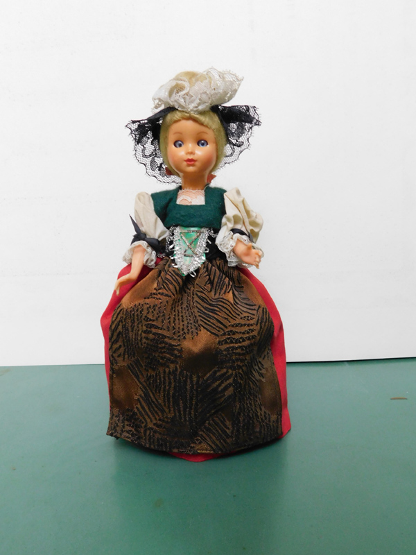 Сувенир лутка (Швајцарска) Е-4327. Сувенир лутка  у националном костиму, област Апензел (Appenzel). Тело је од пластике, руке, ноге и глава су покретни, као и очи светло плаве боје. Плава коса сакупљена је у високу пунђу око које су бела и црна чипка са црвеном машном (на врату).  Бела блуза са чипком на крајевима рукава и црним машнама. Преко кошуље је зелени, чојани прслук, и широк појас око струка са корсетом. Дуга црвена сукња са браон кецељом, испод које је бела подсукња од чврстог платна. На ногама црне гумене ципеле. Лутка је из 1970 их година.